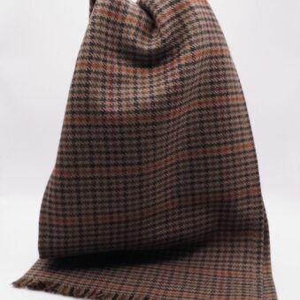 Pañuelo de cuadros en tonos marrón y negro, hecho a mano, con unas medidas de 150×27 cm, su diseño versátil permite múltiples formas de uso, ya sea como complemento para un abrigo o como accesorio distintivo.